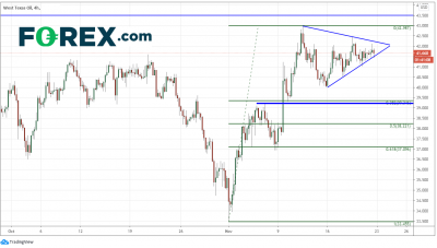 西德州原油已自选举低点回升至43.00附近高点,并且自11月11日以来一直交投于对称三角形内部。对称三角形的预期为价格将展开与进入三角前走势相同方向的突破,在这里,即上破。此外,在11月11日高点后的回调走势后,汇价甚至都未接近38.2%回档39.35,仅交投探向心理整数位40!第一个阻力位在前高点42.97,然后是8月高点43.50附近。