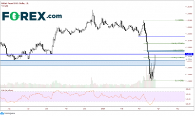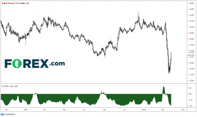 3月9日,英镑/美元于1.3200构筑高点,随后,由于鲍里斯·约翰逊看起来尚未就新冠肺炎大流行做好100%的准备,货币对开始交投走低。此外,在当时,随着全球股市开始抛售并探入熊市,美元成为避险对象。3月20日,英国央行将利率下调至0.1%,货币对跌至1.1410低点,而美元指数正攻入最高点。在下方图表中,底部显示了英镑与美元指数之间的相关性。在2月20日英镑/美元见顶之前,货币对打破正常行为模式,相关性为正。随着价格见顶,相关系数开始下降,目前为-0.97,这意味着英镑和美元在97%的时间中背道而驰!