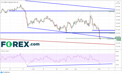 120分钟时间框架内,大选夜以来,美元/日元自105.33高点探入今天低点103.66。货币对落在10月21日启动的下斜趋势线及10月29日低点以来127.2%斐波拉契扩展位略下方。RSI与价格走势产生背离。留意汇价可能反弹重回103.80/104.00区域,卖盘或于附近等待入场。上方水平阻力位在104.20附近。下个支撑落在5月以来长期趋势线103.30附近。