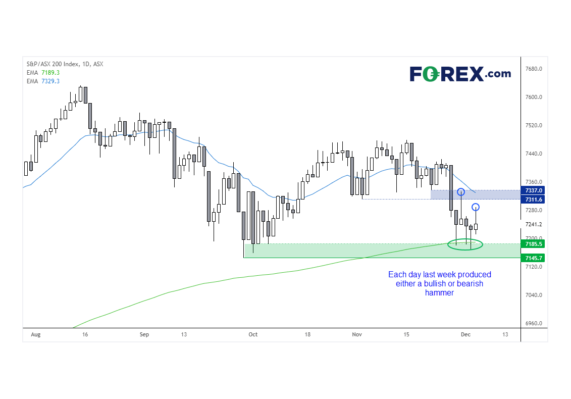 ASX 200指数继续在7200-7300之间震荡,上周的每一天要么形成看涨锤子要么形成看跌锤子K线。日图收于7337上方或7154下方之前,首先的策略仍然是区间交易。