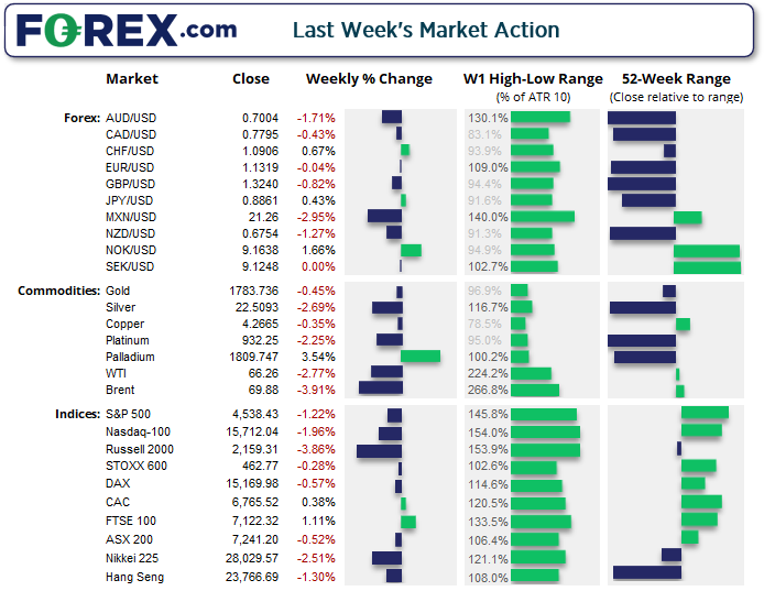Russell 2000指数在200天指数移动均线处遇阻并下跌2.1% ;标普500指数下跌0.86%,回到50天指数移动均线下方;纳斯达克100指数同样走弱,下跌1.7%。上周科技股下跌2%左右,其中FANG+指数跌5.9%,至1个月低点。