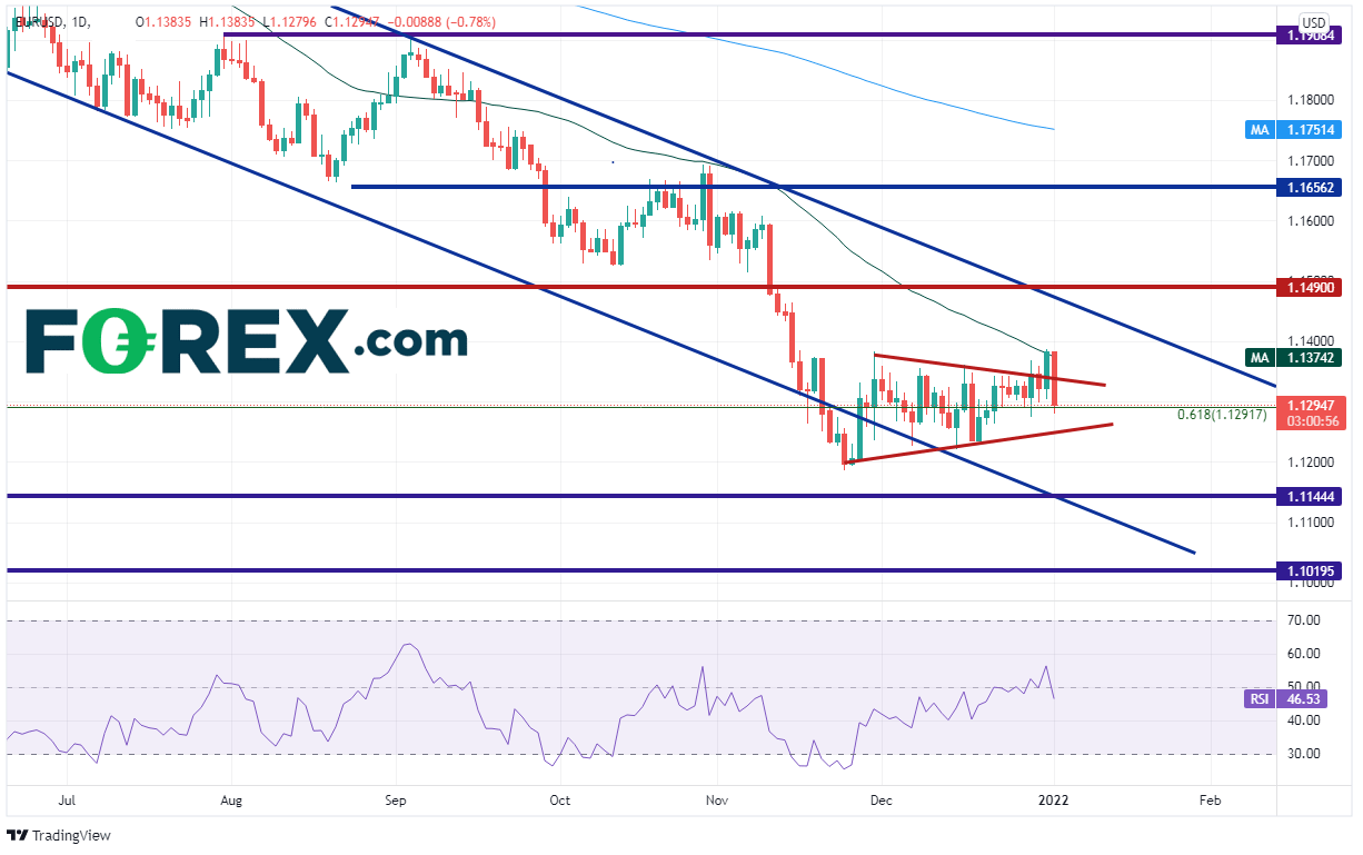 正如我的同事Matt Weller早前所述,美元在新年第一个交易日实现开门红。美元指数假下破2020年3月高点到2021年1月低点的50%回档位附近,后从略高于50天均线所在的95.57,即95.65处暴涨至96.32高点,回到了对称三角形内。随着美元大举上攻,欧元/美元也大举下破且形成看跌吞噬K线,跌幅超过100点子。