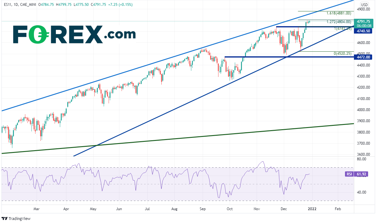 标普500指数去年无数次试图走低,但都得到逢低买盘的支持。该大盘基准股指延续始于2020年3月的上涨趋势,2021年全年走高。交易者等待其下破上升楔形,但一直未能如愿。交易者会在2022年得到通胀忧虑的特别帮助而如愿吗?标普500指数上周再创新高。(按捕捉隔夜交易数据的期货合约所示)。阻力位在12月17日高点到12月20日低点行情的127.2%扩展位,即4804附近,然后是楔形上轨上斜趋势线4860附近,接着是前述行情的161.8%扩展位,即4881附近。但请注意,RSI目前与价格背离,暗示股指或许准备回调。支撑位在前高点4743.25附近、楔形下轨上斜趋势线4575附近,以及12月20日以来低点4520.25。