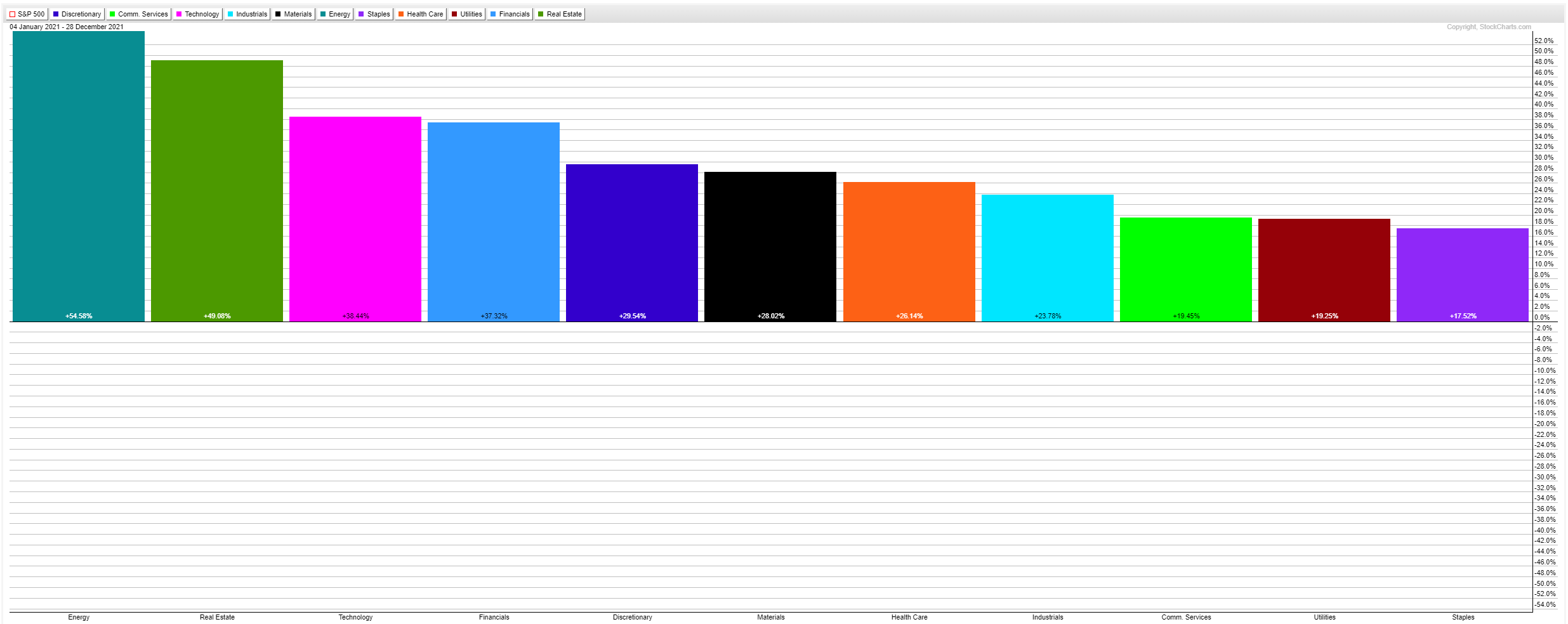 纵观美国股市后可以得出一个强有力的结论,即每个板块都很“成功”。如下图所示,今年每个主要板块都上涨,即使表现落后的必需消费品、公用事业和通讯服务板块(市值加权后)也平均斩获近20%的涨幅,更不要说领涨的能源和不动产板块: