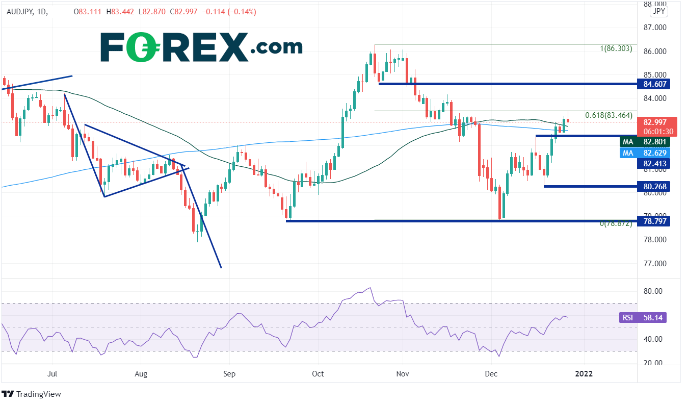 澳元/日元是另一个和标普500指数挂钩的典型日元货币对。该货币对从12月21日的80.75反弹至10月21日高点到12月3日低点的61.8%回档位83.46后止步,期间站上50天和200天均线,分别落在82.80和82.63,使其现在转化为支撑位。请注意下图底部澳元/日元和Emini标普期货的相关系数,目前报在+0.88。这也是个表明强正相关的读数。阻力位在前述61.8%回档位83.46,接着是水平阻力位84.60。下方支撑位有均线之下的水平支撑位82.80,接着是80.36。