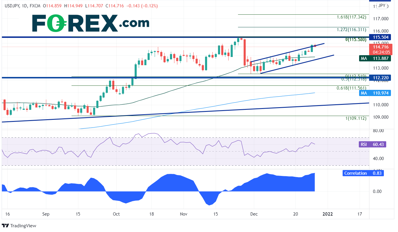 我们很多次看到日元货币对跟随冒险或避险情绪的经典时刻。比如,美元/日元12月21日开盘报在113.57,昨天收在114.86,5天内反弹129点子,还收上12月1日以来的上升通道的上轨上斜趋势线。请看下图底部美元/日元和Emini标普期货的相关性,目前报在+0.84。两者相关性报在+0.80左右就被视为存在强正相关联系。阻力位在前高点115.52,接着是11月24日高点到12月3日低点的127.2%和161.8%扩展位,分别落在116.31和117.34。支撑位在周一低点114.31附近构成的水平支撑位,然后是200天均线和上升通道下轨相汇的113.89。