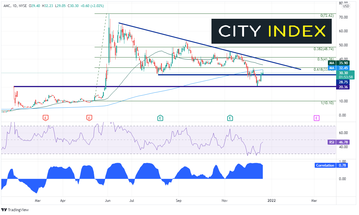 AMC Entertainment是互联网炒热的另一只吸引买盘的股票。一年前其交易价格约为4.50美元。但在6月2日,交易员将AMC一路推高至77.62高点。该股自12月初以来与罗素2000指数之间的相关系数强劲,但近期降至+0.78 (仍然很强,但略低于+0.80“强相关”水平。)该股自高点回落后一直在50天均线附近震荡,并构筑一系列高点降低。和GME一样,AMC价格已跌破5月13日低点至6月2日高点上行之61.8%回档。但与前者不同的是,AMC下穿关键支撑28.75并交投于水平支撑位20.36附近。RSI在超卖区形成双底,股价得力反弹。阻力在12月21日高点和200天均线32.45附近。50天均线落在略上方的35.89。请注意12月21日成形的流星线。这表明反弹可能已经告一段落。