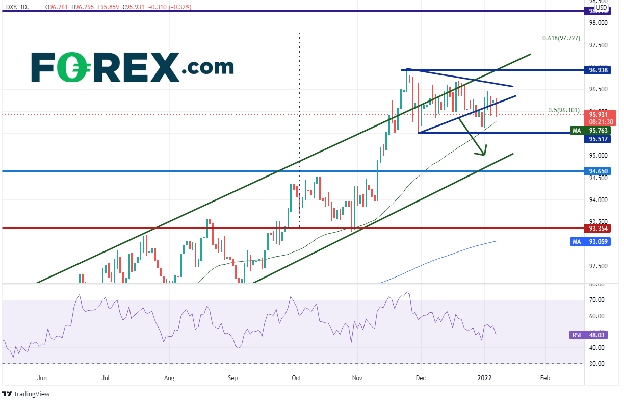 美元指数继续陷于持续近2个月的区间95.50/97.00,但确实在非农就业报告发布后有所下跌,回到对称三角形的上斜趋势线下方。下方支撑位在50天均线95.76附近,接着是2021年11月30日低点95.51。美元指数在12月打破2021年5月以来上涨通道(请看绿色线)的上轨,但未能守住突破行情。当价格突破通道一端失败后通常会去考验通道的另一端,也是美元指数的下个支撑位所在的94.90附近。