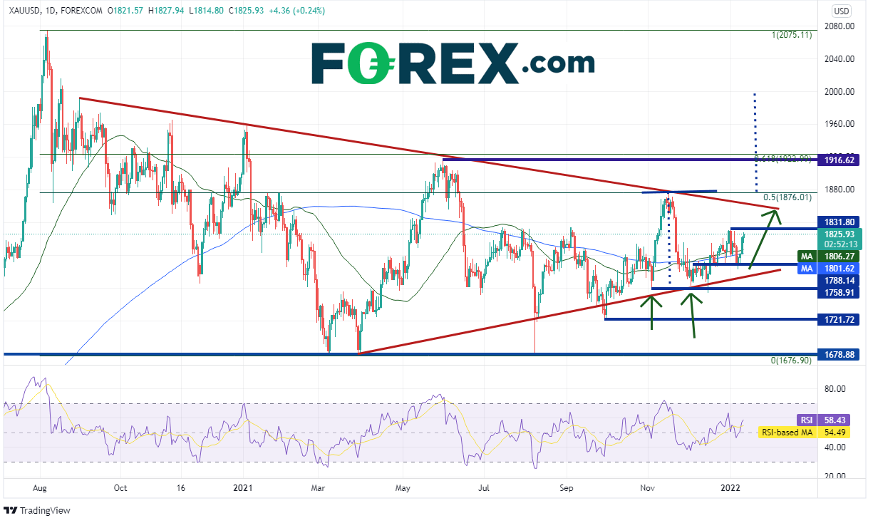 美元下跌利多黄金。如果美元指数继续下破2021年5月以来通道的下轨趋势线,黄金或持续走高并带动澳元/美元随之上涨。