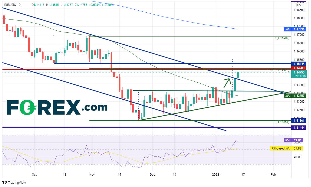 欧元/美元的走势和美元指数相似但方向相反。该货币对昨天上涨,上穿2021年5月以来通道的上轨趋势线。但和美元指数不同的是,欧元/美元还打破了上升三角形形态。该形态突破后的目标在1.1555附近,而在到达目标的路上还有不少阻力需要克服,包括强有力的长期水平阻力位兼2021年10月28日高点到2021年11月24日低点行情的61.8%回档位1.1490附近,以及小级别水平阻力位1.1525。如果受制于阻力,可能回落至1.1477附近的破败趋势线。