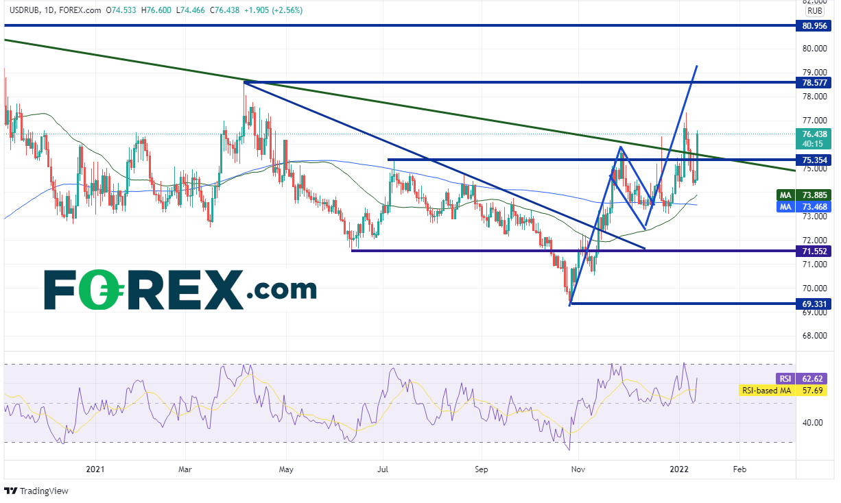 美元/俄罗斯卢布2020年3月在82.86创下疫情期间高点,此后不断走低并形成下降三角形(请看绿色线),后于2021年11月中旬站上200天和50天均线且此后始终守于其上。但该货币对难以攻克三角形下降趋势线(请看绿色线)所在的75.63构成的阻力,随后形成旗形盘整形态。2021年12月中旬,美元/俄罗斯卢布打破该旗形形态,此后始终围绕三角形趋势线徘徊,与此同时守住分别落在73.46和73.88的200天与50天均线。该货币对周四受Ryabkov评论的影响回到三角形趋势线上方,呈现攻克1月6日高点77.34之势。旗形突破后的目标在79.25附近的2021年4月6日高点上方。下档支撑位在50天和200天均线。