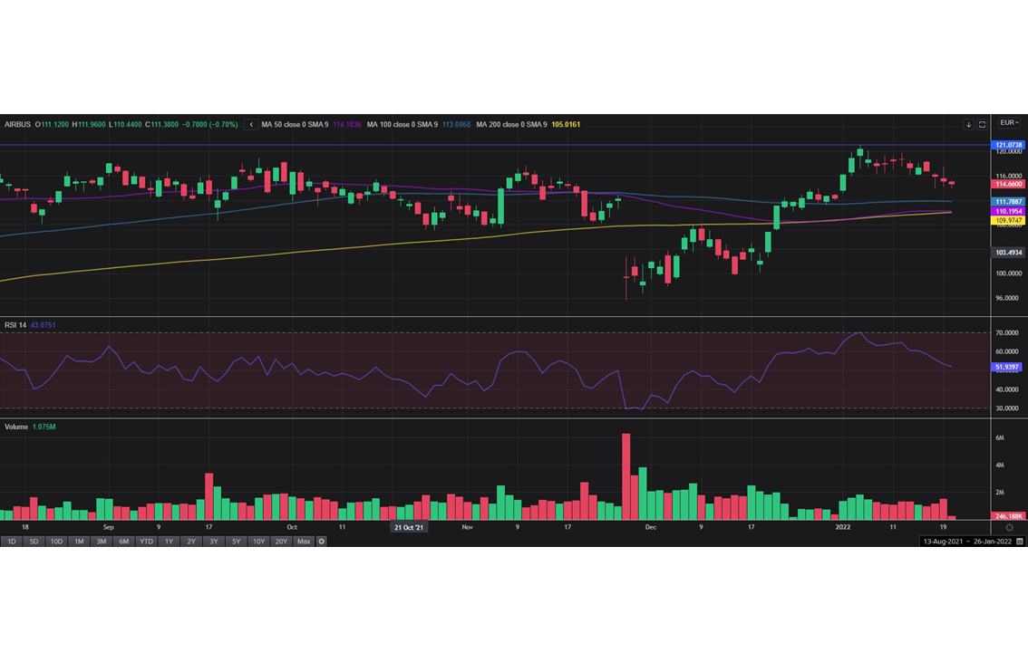 空客股价在过去半年里两次触及疫情后期高点121,该位也是后市的主要上行目标。然而,自从上次触该关键阻力后,股价颓然回落,过去10个交易日有9个交易日收低。新年以来,多空双方紧张拉锯,最终空头险胜多头。RSI依然略微看涨但也在下行,即将进入看跌区域。
