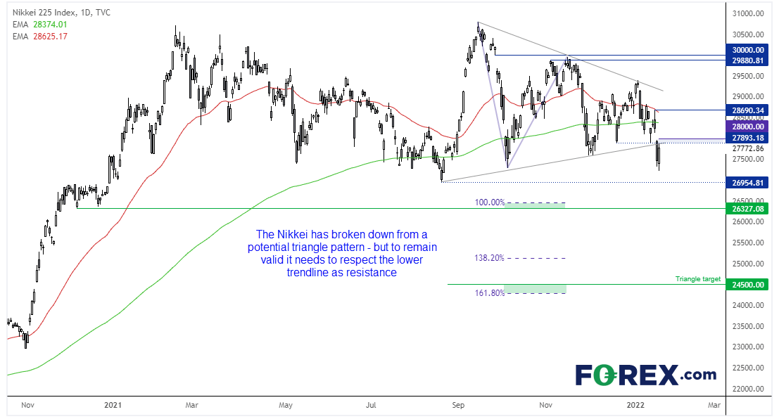 日经225指数的多头局面并不乐观。这个技术敏感型股指已自1月高点跌逾7%,昨天触及100天低点,目前交投于200天指数移动均线下方,28,690高点未能突破50天均线,受阻后加速回落,确认了看跌三角形突破。该形态突破后的目标在24,500附近,不过需要价格保持在三角形下轨趋势线之下以使突破保持有效。