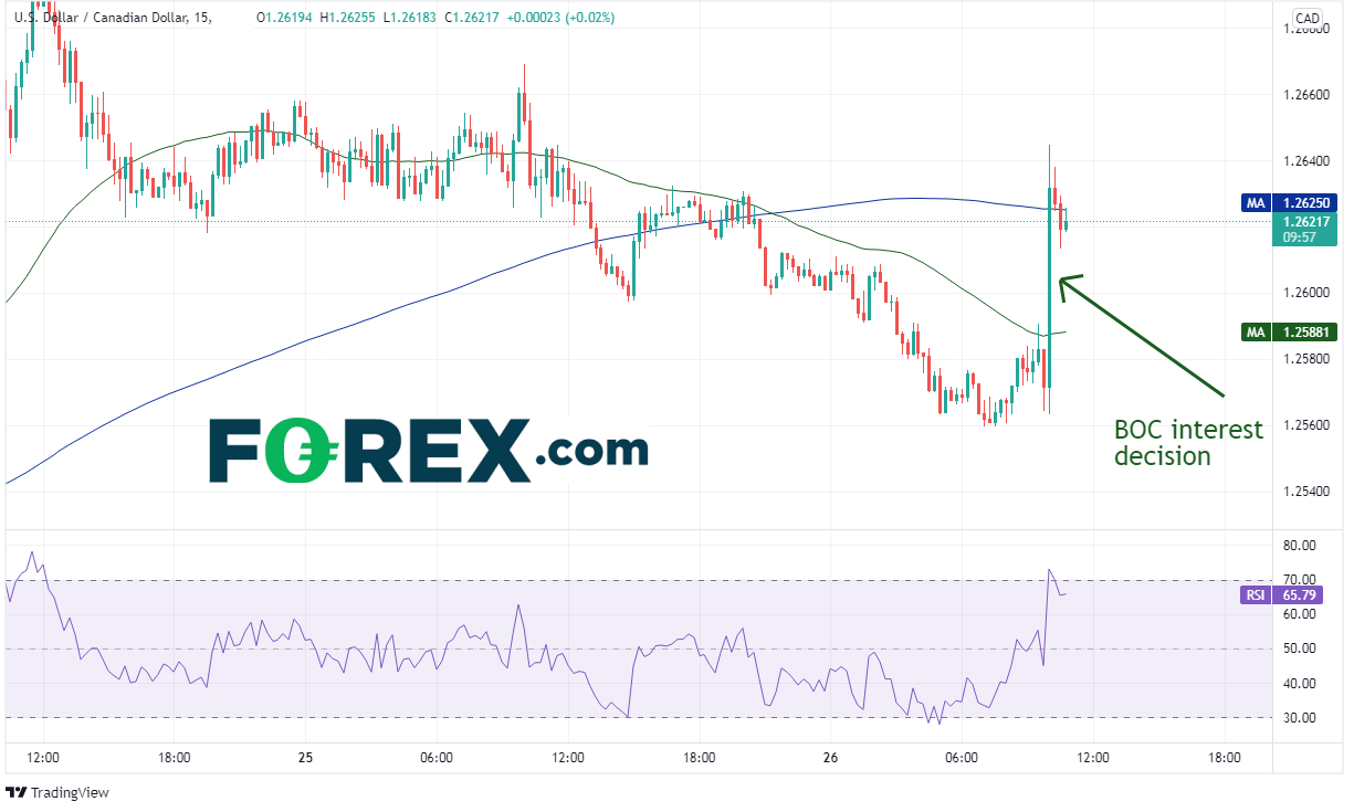 交易者随后评估加拿大央行的立场是否变得更加强硬,导致美元/加元涨跌不定。15分钟后,该货币对断然上涨,自1.2563升至1.2645。