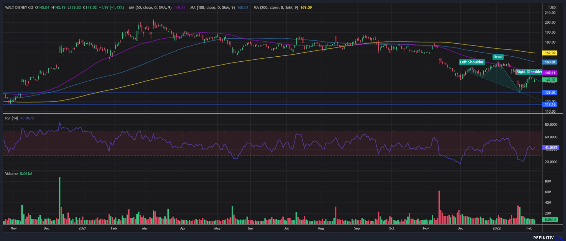 RSI与均线看跌(50天均线、100天均线和200天均线空头排列),表明股价可能进一步承压下行,并且得到了过去三个月可能形成的头肩顶形态的佐证。该形态要想成立,需要价格下破129低点,然后后市可能下探2020年10月低点117。