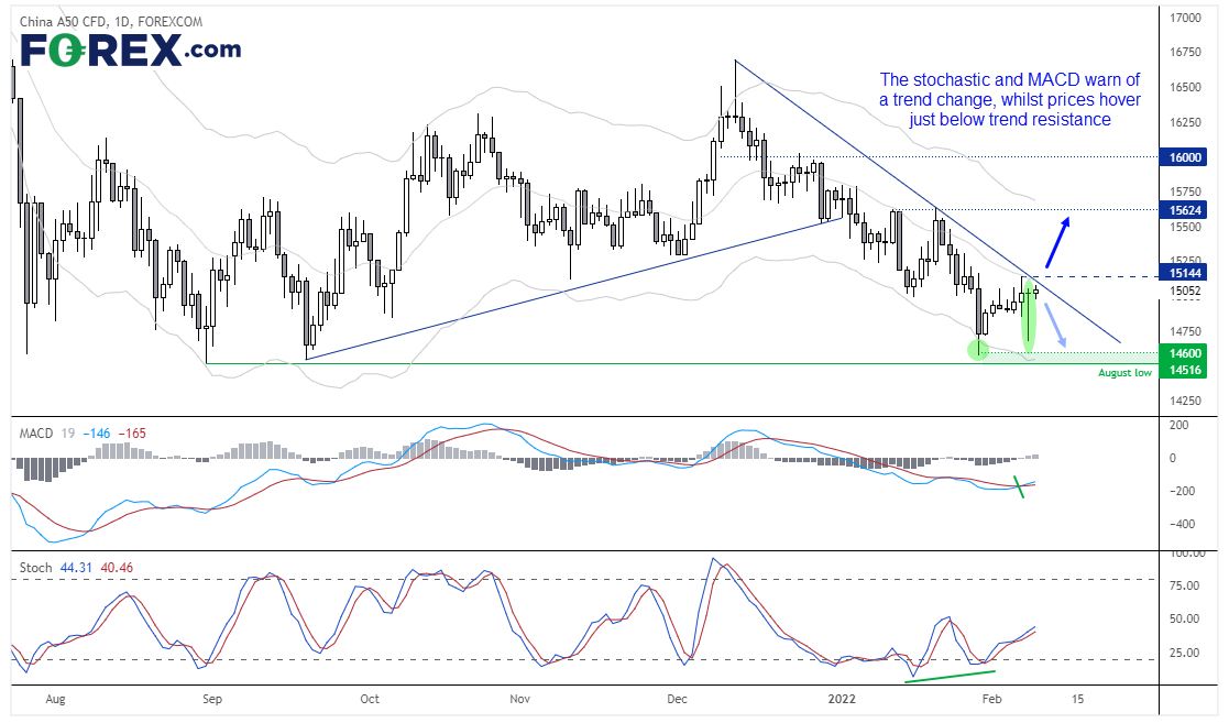 中国A50指数已自12月最高点回落逾12%,今年迄今跌幅在3%左右。股指跌势止步于8月低点14,516上方且形成下影线(表明4,600附近存在买需),之后在Keltner通道下轨内反弹并反击了20天指数移动均线。中国A50指数昨天先是下跌,后在干预报道作用下反弹,收出一根看涨pinbar、构筑上抬的低点。