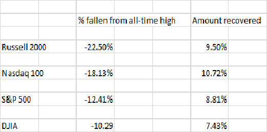 美国四大股指(标普500指数、纳斯达克100指数、道指和Russell 2000指数)中,如果按历史高点以来的跌幅衡量,Russell 2000指数的表现最差。这个小盘股指相比2021年11月创下的历史高点下跌超过22.5%,进入熊市区域。到目前为止,该股指收复了9.5%的失地。请看下面的对比图: