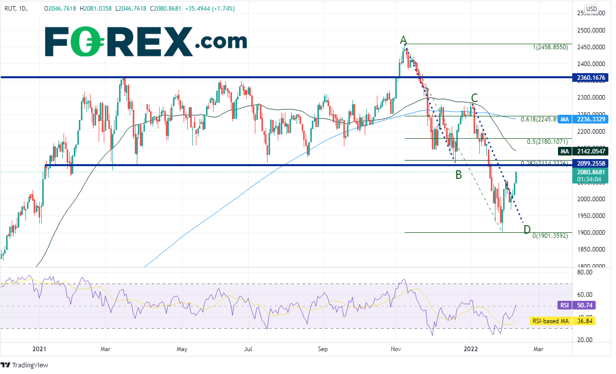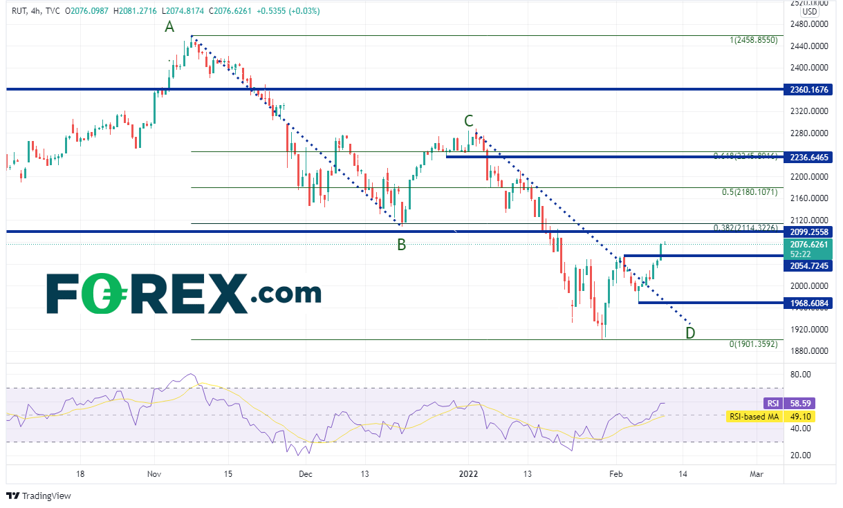4小时图上的AB=CD形态更加清晰。Russell 2000目前逼近由长期水平通道的下轨趋势线和2021年11月高点到1月28日近期低点行情的38.2%回档位组成的阻力带,即2099.25 - 2114.32区间,再往上的阻力落在前述行情的50%回档位2180.11,然后是又一阻力带,由水平阻力位和61.8%回档位构成的2237/2246区域附近。下档支撑位有水平支撑2054.72、2月4日低点1968.60和1月28日低点1901.36。