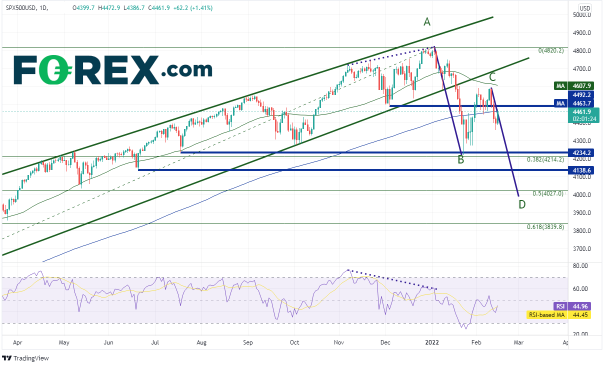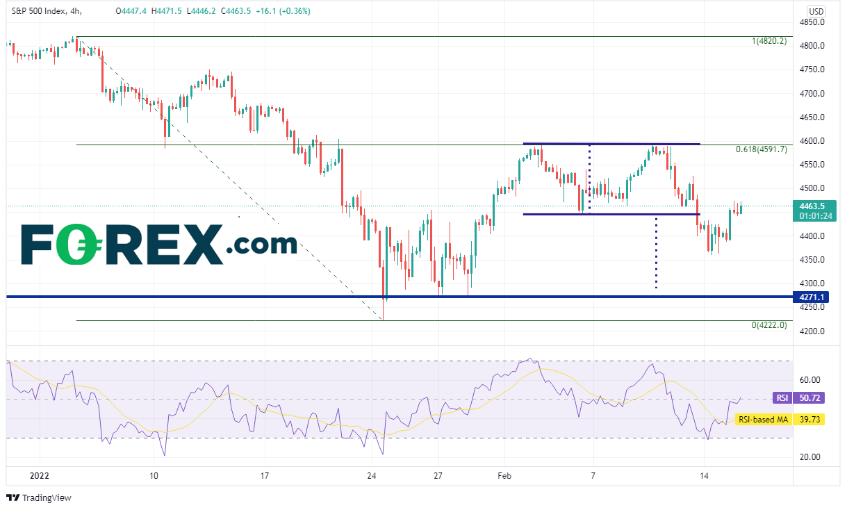 年初以来股指震荡不止,大部分成因与通胀和俄罗斯可能入侵乌克兰有关。FOMC下次会议还有一个月才会召开而俄罗斯在撤军,可能使得焦点落在媒体头条上。如果有迹象显示,业已高涨的通胀上升速度可能还要加快,或者俄罗斯可能再度增兵,则标普500指数后市难免继续震荡。