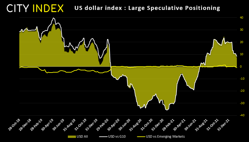 美元整体净多头头寸规模跌至6个月低点,并连续第四周走低。此外,净多仓较前一周下跌了26%。这一走势和美联储将很快走上激进加息之路的预期背道而驰,却相当符合我们对2022年的前景展望,即商品货币在年初疲软之后,第二季度可能会表现良好。