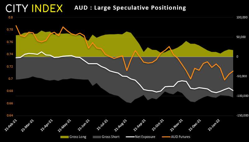 空头开始重返澳元,与上周相比,总空头头寸增加了4.4万合约,总多头头寸减少1.5万合约。尽管美联储立场强硬,但澳洲联储季度在《货币政策概要》中表示“准备保持耐心”后继续鲜明鸽派立场,因此空头似乎没什么理由很快平仓出场。