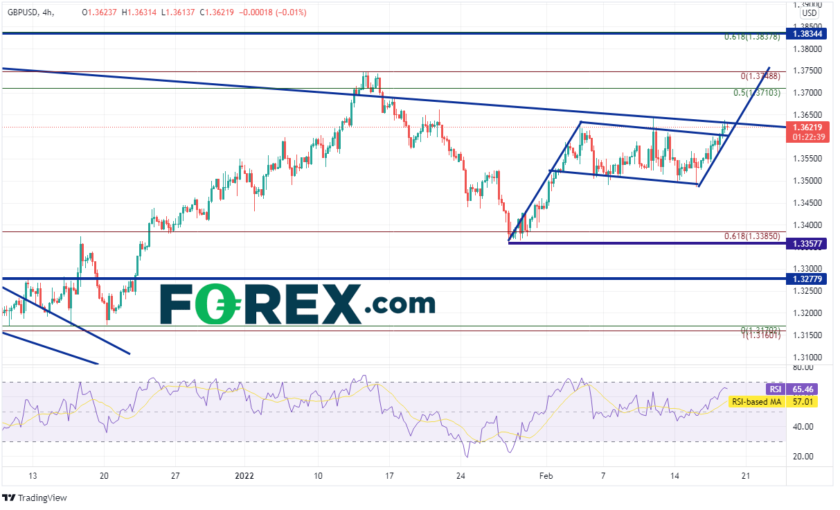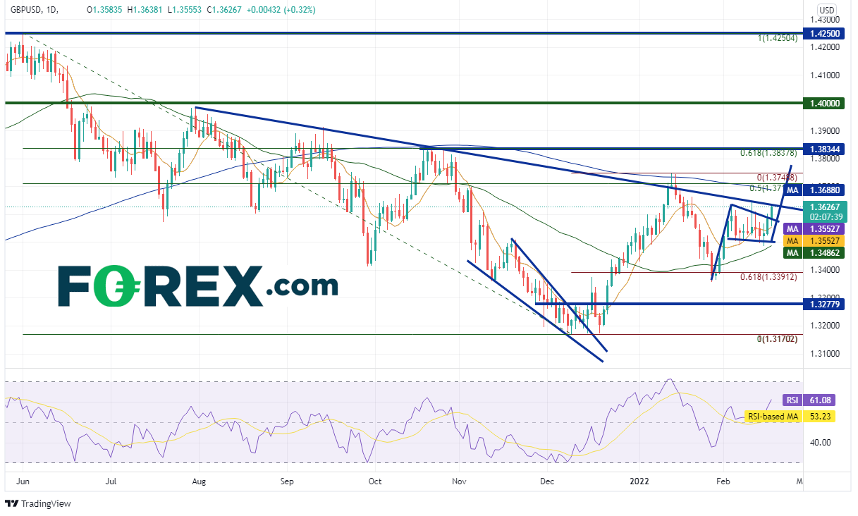旗形形态的目标在1月13日高点1.3760附近,即1.3749。要到达该目标的前提是收上2021年7月30日以来的趋势线所在的1.3635和200天均线1.3688。旗形目标之上的阻力有1月13日高点、长期区间的61.8%回档位1.3838。第一支撑位在旗形上轨趋势线下方不远处的1.3600附近,然后是旗形低点与50天均线1.3486,接着是1月27日低点1.3358。