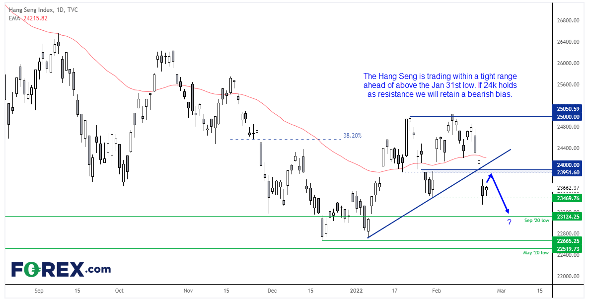 中国股市今天继续承压,一方面可能是因为俄罗斯入侵乌克兰造成的全球负面情绪,另一方面可能与中国政府继续遏制房地产业与科技公司无序过度发展的担忧情绪有关。今天早些时候,中国国家媒体评论,警惕“房地产市场的过快增长”与超级宽松的货币政策,以免推动房价上涨过快。在此之前的过去两个月里,人行下调1年期和5年期LPR一次。CSI300指数跌约3%,而恒指仅下跌0.2%。