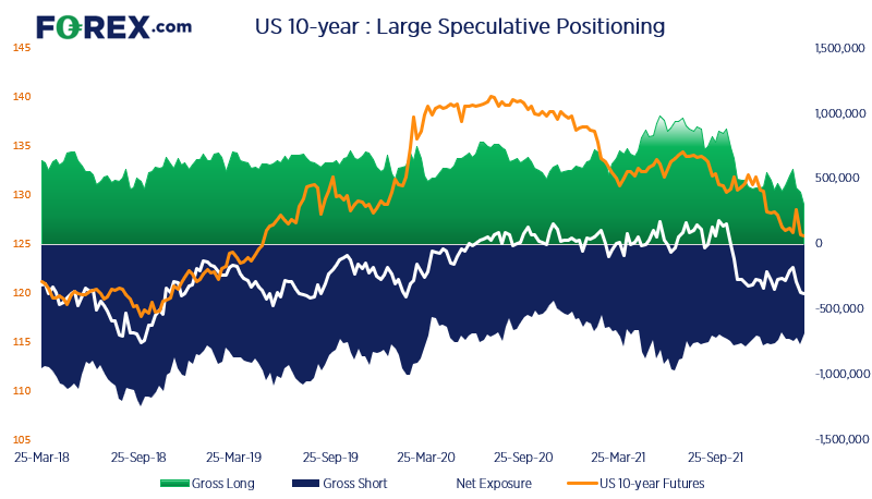 债券价格与其收益率反向波动,即价格下跌时收益率上涨。所以,我们有必要指出,大型投机者对10年期美债的空头持仓为2020年2月新冠疫情席卷西方国家以来的最高点,这实际上可视为看涨收益率。债券价格下跌的趋势丝毫没有马上触底的信号。