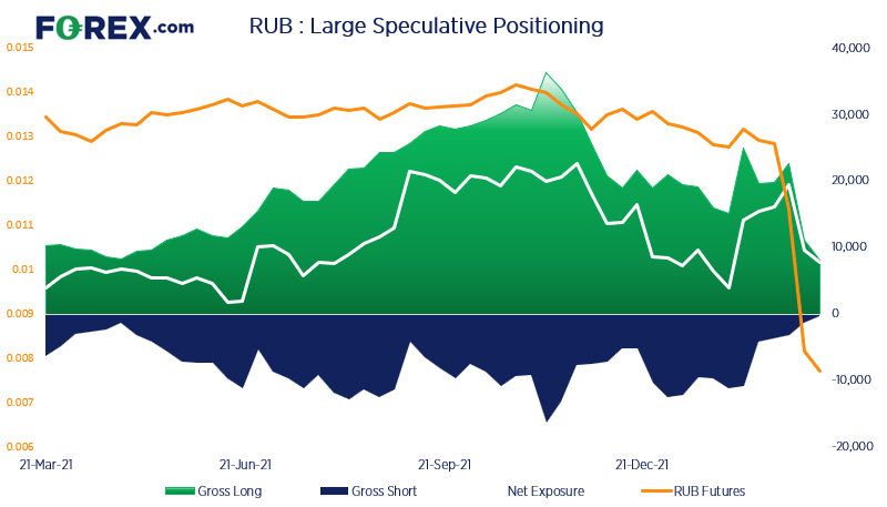 上图有两个关键特征:卢布直线下挫,CME交易所的大型投机者正在削减该货币的持仓。俄罗斯关键人物与央行两周前遭到严厉制裁,卢布暴跌近40%。制裁措施宣布之后,卢布的总多头和总空头都显著减少。俄罗斯目前关闭国内股市并实施资本控制,大型投机者削减卢布持仓也在情理当中。对很多人来说俄罗斯市场目前都不是理想的交易市场,但至少突显出人们对俄罗斯市场的态度,即回避。