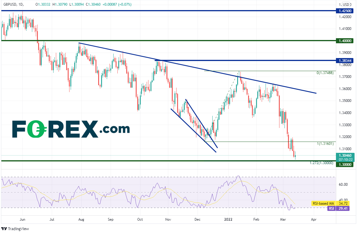 自从2021年6月1日创下1.4250高点以来,英镑/美元不断走弱,于2021年12月初触及1.3160低点,之后反弹并摆脱下降楔形,在2022年1月13日摸至1.3749附近的下降趋势线,随后再度走低且攻克12月初低点,最低跌至2021年12月9日低点到2022年1月13日高点行情的127.2%扩张位兼心理整数关口1.3000附近。