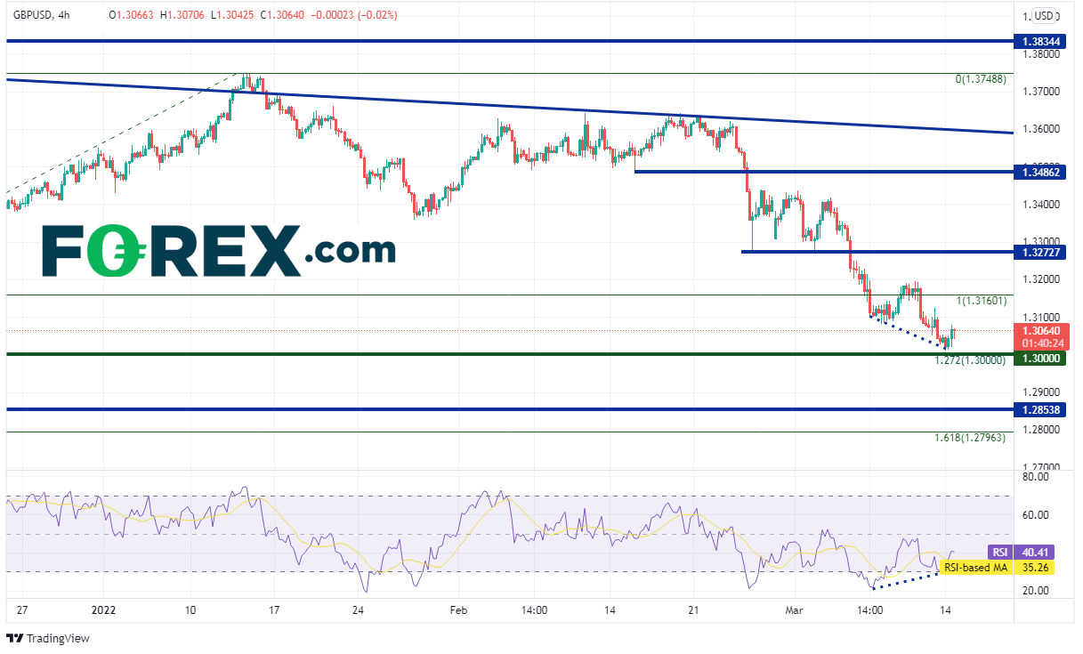英镑/美元4小时图上的第一个支撑位在上述1.3000,然后下看水平支撑位兼2020年11月以来下影线低点1.2854,接着是上述行情的161.8%扩展位。但请注意,RSI目前与价格背离,暗示价格可能准备回升。上档阻力在12月9日以来的前低点1.3160,然后是系列前低点和水平阻力位1.3273。