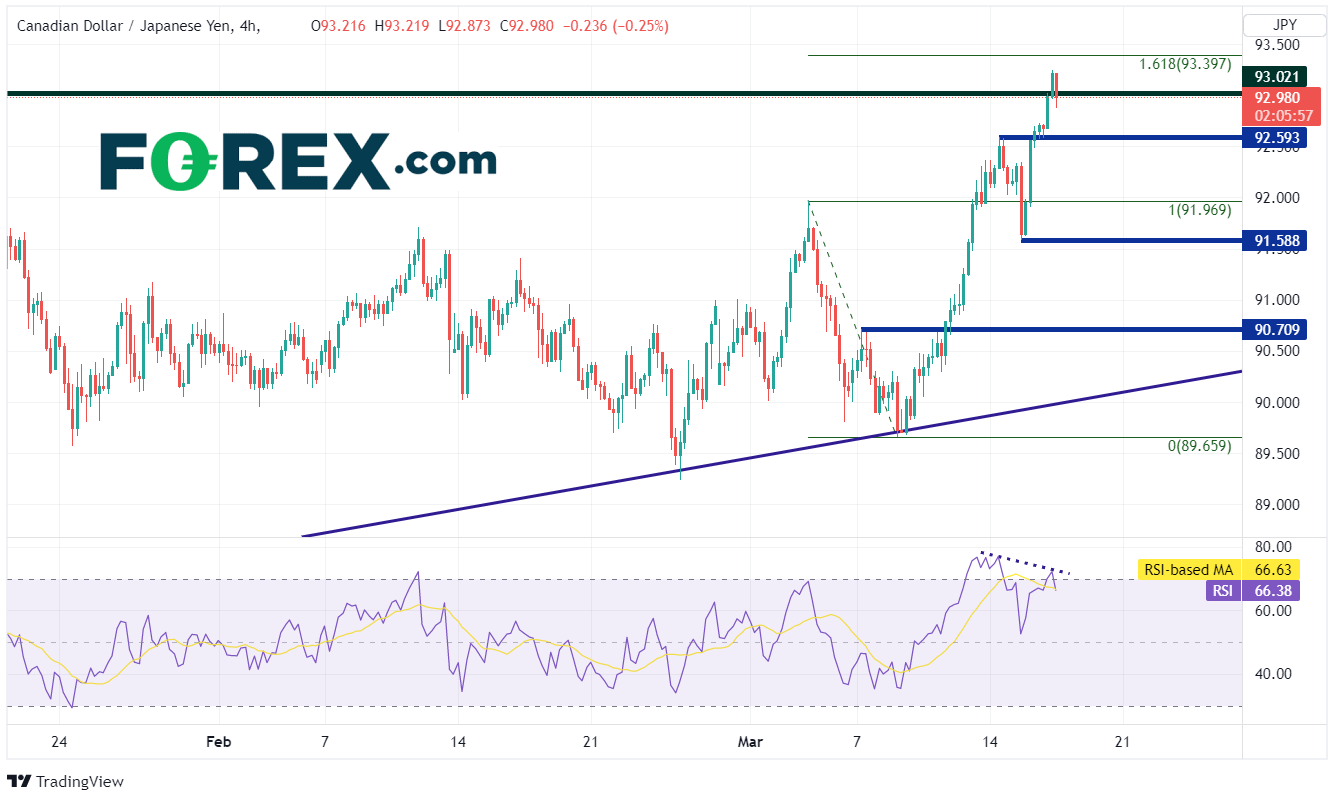但请注意,RSI目前与价格背离,暗示价格可能准备回撤。第一支撑位在水平支撑92.59,然后是3月3日以来高点91.97,接着是3月8日低点91.59和水平支撑位90.71。
