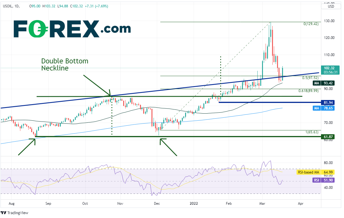 西得州原油在12月2日最低点触及62.78,截至3月7日价格翻倍有余,在俄罗斯入侵乌克兰与随后遭到制裁的推动下摸至131.30。当时RSI严重超买,暗示价格无法持续高位运行。自那以后,有关俄乌有望停火的评论推动油价于周二跌至短线低点93.97。今天油价重拾升势,斩获近8%的涨幅。第一支撑位在周二低点和50天均线合围而成的93.42-93.97区间,然后是2021年12月低点到3月7日高点行情的61.8%回档位89.99,接着是双底形态的颈线85.39附近。