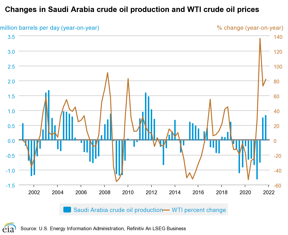 如果着眼于OPEC最大产油国沙特阿拉伯的供应量,可以特别清晰地揭示OPEC产出与油价之间的关系。事实上,很多人仅以沙特阿拉伯作为全球原油市场流动性的指标。