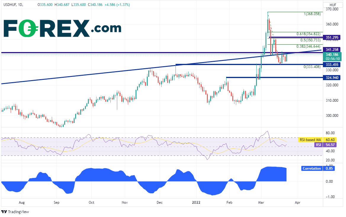 高企油价与对战争的关切提升了通胀,促使匈牙利央行周二加息100个基点,至4.4%,幅度创下2008年以来之最。但此举对匈牙利福林的影响甚微。美元/匈牙利福林与油价之间存在高度正相关联系,前者在过去一个月一直受到后者的驱动。两者目前的相关系数为+0.85。相关系数高于+0.80,视为强关联。当俄罗斯侵入乌克兰,美元/匈牙利福林与油价一起走高,双双于3月7日创下高点,其中前者的高点在368.058。后来两者双双回撤至支撑位,其中前者在3月17日构筑短线低点333.41。但自那以后油价反弹至61.8%回档位,美元/匈牙利福林却止步于水平兼趋势线阻力。相关性衡量2种交易产品同向波动的频率,而非波动的幅度。