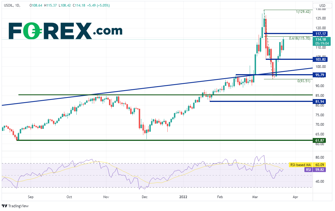 在这些媒体头条和消息作用下,西得州原油价格不断上扬,自2020年春季以来有序形成上涨通道。但到了2月28日,因俄罗斯入侵乌克兰,油价加速上涨,于3月8日创下129.42高点。油价在3月15日回撤至93.56附近支撑位,此后再度因为上述因素大举冲高。油价今天止步于115.37,其略低于3月8日高点到3月15日低点行情的61.8%回档位115.70。该低点之上为水平阻力位所在的117.17,如果攻克,有望上看近期高点129.42。支撑位在周二低点107.12,然后是水平支撑位103.82。