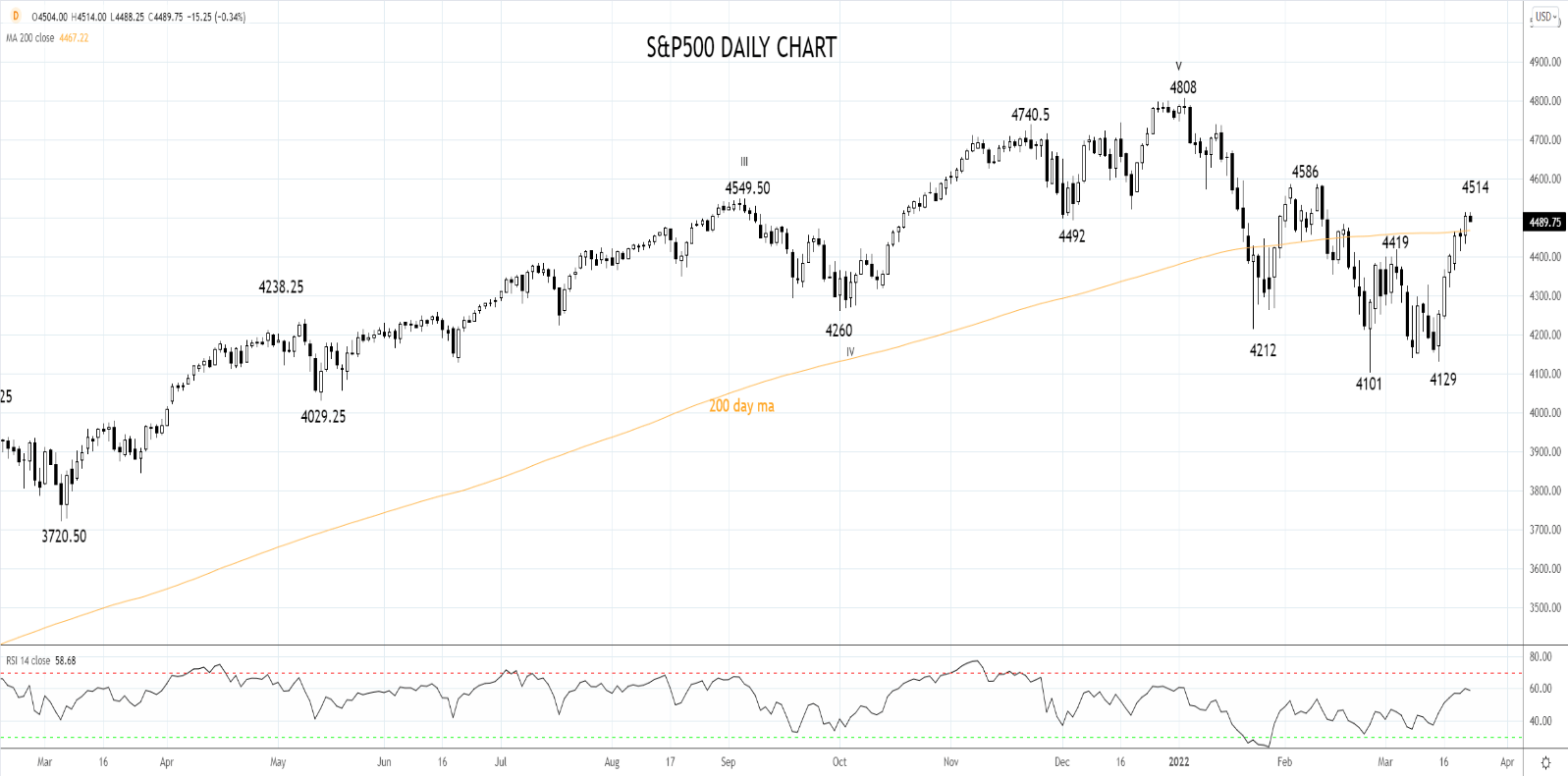 标普500指数日图能够首次收上200天均线4464是个好现象,如果守住4400/4380支撑位,有机会扩大反弹,上攻4580/4600,甚至4700。