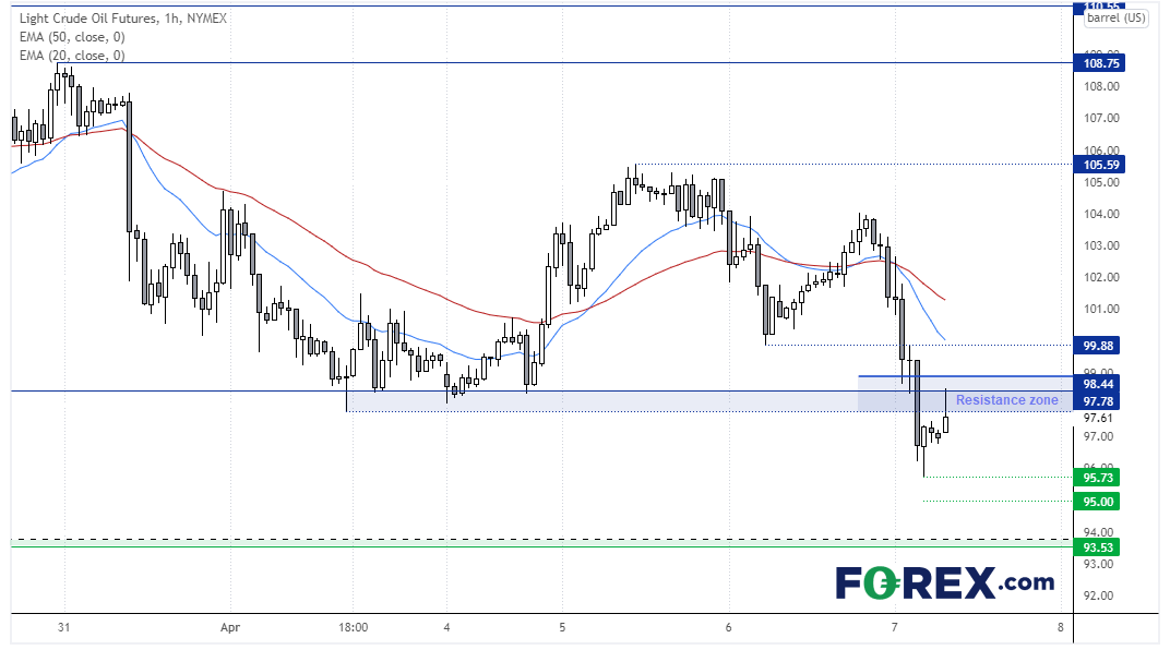 我们可以看到西得州原油小时图跌穿了97.78支撑位,但自那以后回到了98附近的阻力带。小时图K线尚未走完,但若形成看跌锤子或在区域上轨下方出现反转K线集合暗示波段高点已就位,可能是个好现象。如果看到下降的高点,我们将寻找看跌结构,目标先后指向该狭窄支撑带上方的96、95,甚至94。