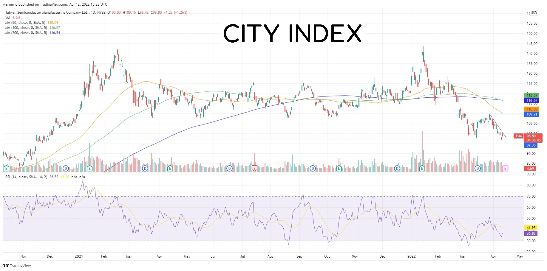 自从1月创下历史新高145以来,台积电股价遭遇严重的下行压力,下跌近30%,最近更是16个多月里首次跌破97。在此之前,即2020年3月疫情爆发以来,股价飚升161%。
