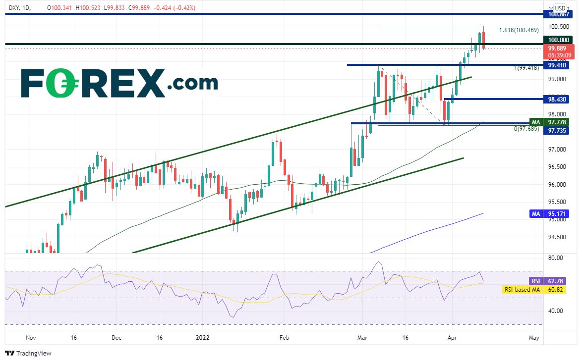 美元以及部分美元货币对和昨天开始下跌的收益率一起回撤。美元指数日图在3月7日高点到3月30日低点行情的161.8%扩展位100.50附近遇阻,今天正在尝试构筑看跌吞噬K线,那是由单根K线形成的反转形态,表现在阴线K线的实体吞没前一天的K线实体。支撑位在向上突破3月7日高点的突破位,即99.42附近。