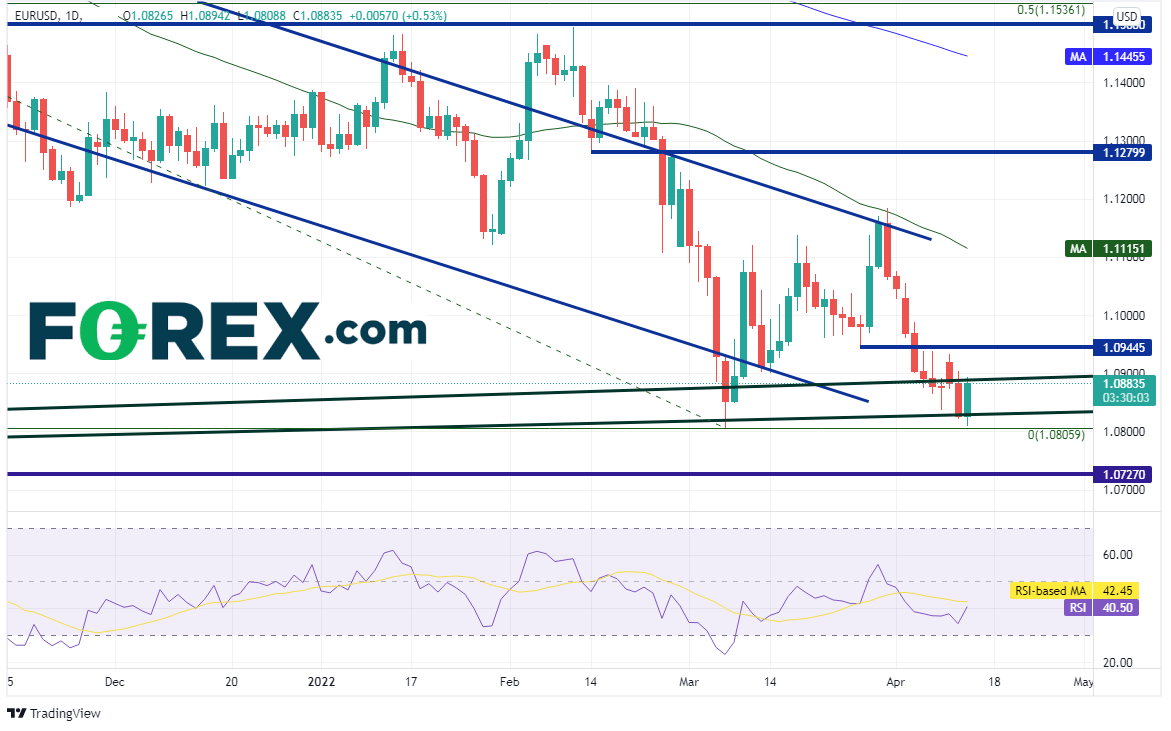 受美元自阻力回落的影响,部分美元指数同样从关键价位回调。欧元/美元止步于3月7日以来低点1.0805附近,今天在上涨,试图形成自己的看涨吞噬K线。昨天高点之上的阻力位落在1.0945,如果攻克,可以畅通无阻地涨至50天均线1.1115。