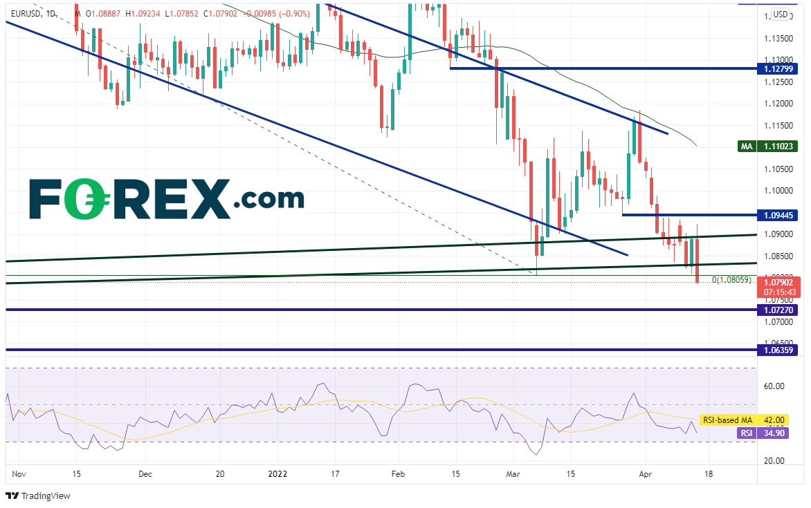 欧元/美元日图自2021年5月以来一直在一个通道内下跌,目前围绕着强趋势线支撑(绿色趋势线)盘整,其中一条源自2017年1月,另一条源自2020年10月。该货币对在今天央行会后回吐昨天的所有涨幅,正在尝试构建看跌吞噬K线。所谓看跌吞噬K线,即价格在前一天收盘价上方形成高点,但收盘回到前一天K线的开盘价下方。欧元/美元也已攻克3月7日低点1.0806。下方支撑位在2020年4月以来的水平支撑位1.0727,以及2020年3月以来的水平支撑位1.0636。阻力位在今天高点1.0923、水平阻力位1.0945、50天均线1.1102。