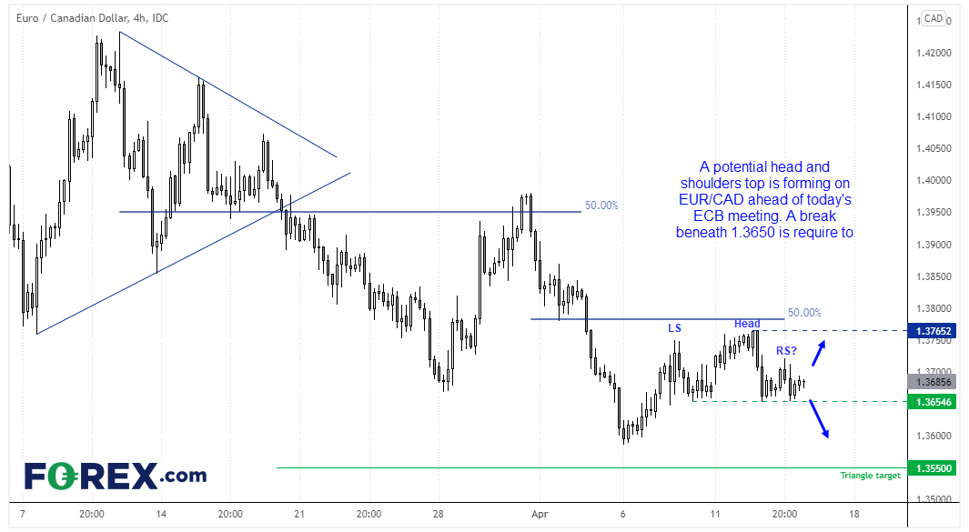 欧洲央行会议在4天长周末假期前召开,所以欧元/加元今天也有很大的可能性不会持续下破。如果欧洲央行会议属于“非事件”事件,我们将关注货币对下周突破关键支撑位的可能性。如果下破1.3650,可确认头肩顶形态并下看1.3600。