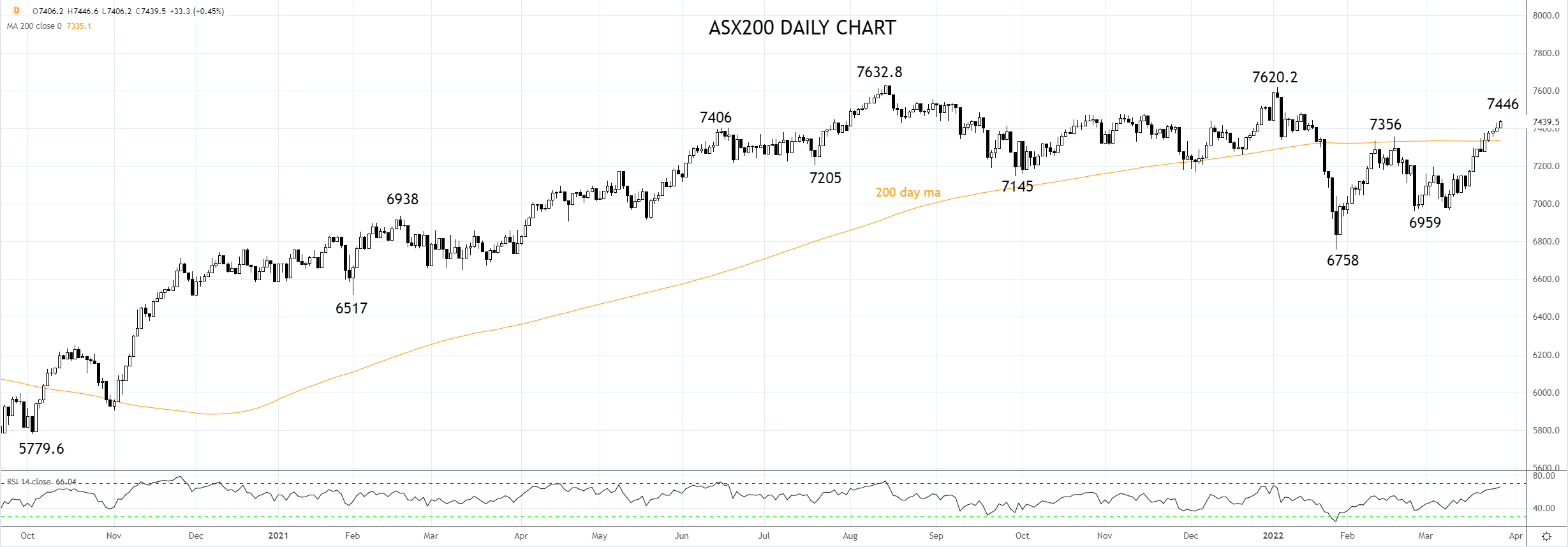 因此,如果ASX200收盘能守住7330/00支撑位,在5月有所回落前,ASX200有望一路走高,测试并突破8月历史高位7632。