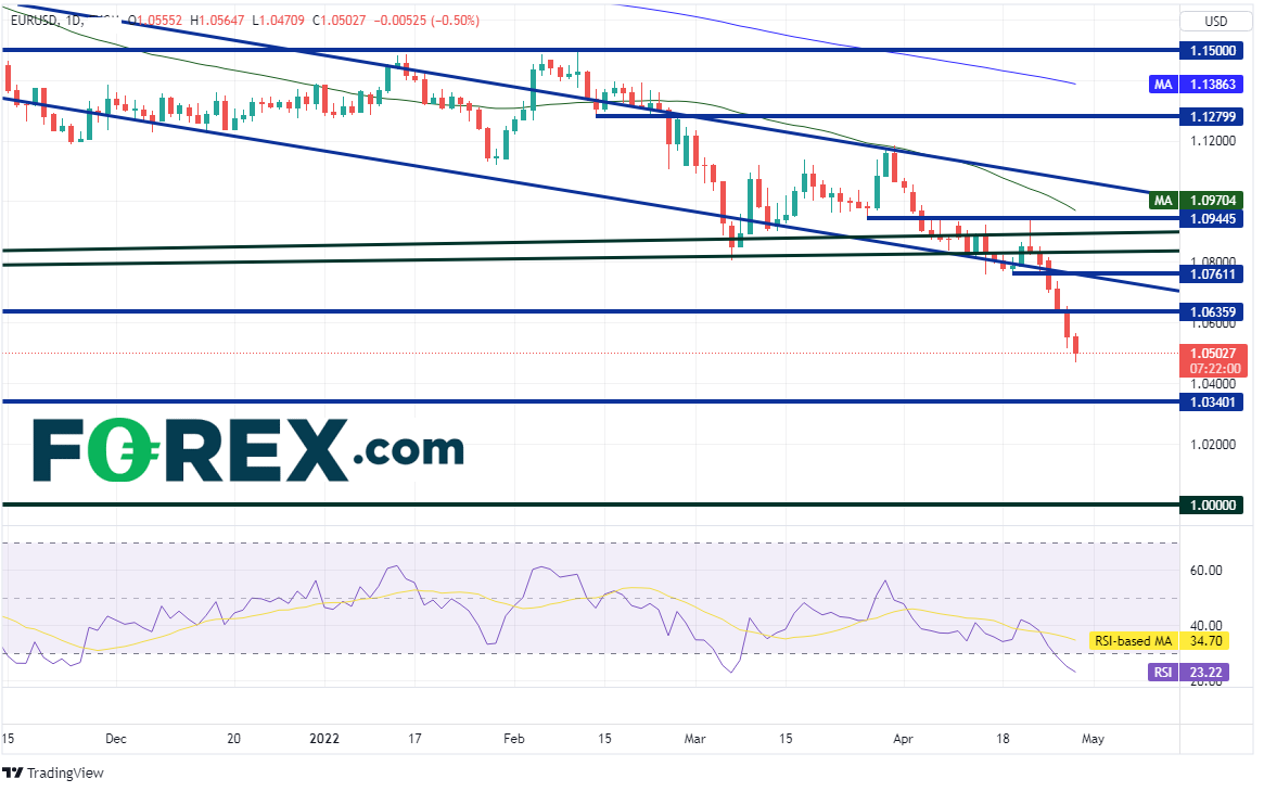 美元强势上涨之下欧元/美元承压跌至2017年1月以来最低点,后市可能下看2017年1月低点1.0340、心理整数关口1.0000。第一阻力在2020年3月前支撑位1.0636,然后是水平阻力位和近期通道的下轨趋势线1.0761附近。