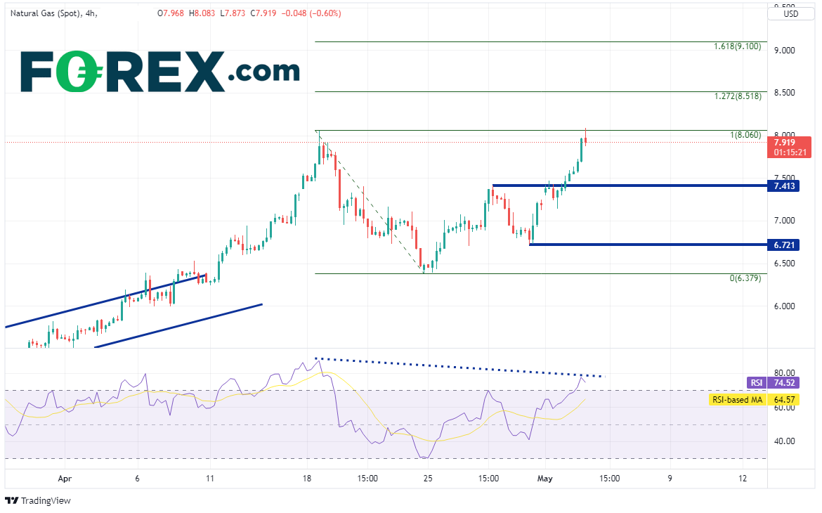 4小时图上的阻力为4月18日高点到4月25日低点行情的各斐波纳契扩展位,其中127.2%扩展位在8.518,61.8%扩展位在9.10。但请注意,RSI目前与价格背离,表明价格短线或回撤。下方支撑位在水平支撑位7.413、4月29日低点6.721和4月24日低点6.379。