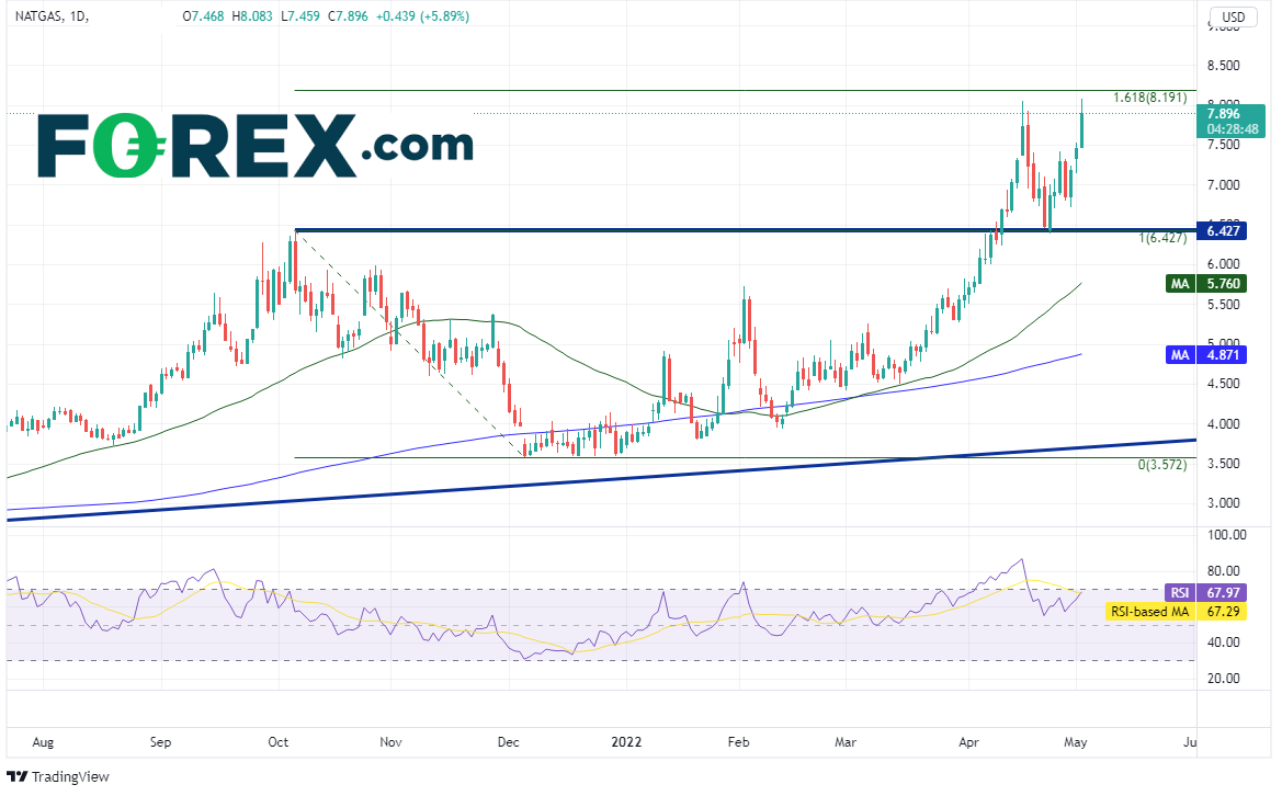 2021年10月26日,天然气价格在6.427创下新高,随后调头向下,于当年12月初回撤至3.572。价格之后再度开始上扬,于4月11日攻克前高点。随着欧洲减少对俄罗斯能源的依赖并且最终不再依赖俄罗斯能源的意图日渐明显,天然气价格走出抛物线式走势,逼近2021年10月2日高点到2021年12月6日低点行情的161.8%扩展位下方,即8.057。当时RSI落在86.50附近的超买位。当RSI高于80,价格被视为超买,后市或回撤。天然气价格确实回撤,RSI也回到中性区域。但价格在4月25日守住前高点6.427,在之后的日子里一往无前,今天在8.083创下历史新高。上方第一阻力在前述161.8%扩展位8.191。