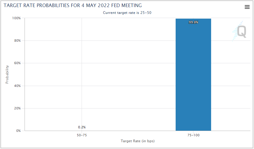 根据CME的FedWatch工具,交易员绝大多数(超过99%)计入上调基准利率50个基点,进入0.75%-1.00%区间。那将是2000年以来首个幅度为50个基点的加息。