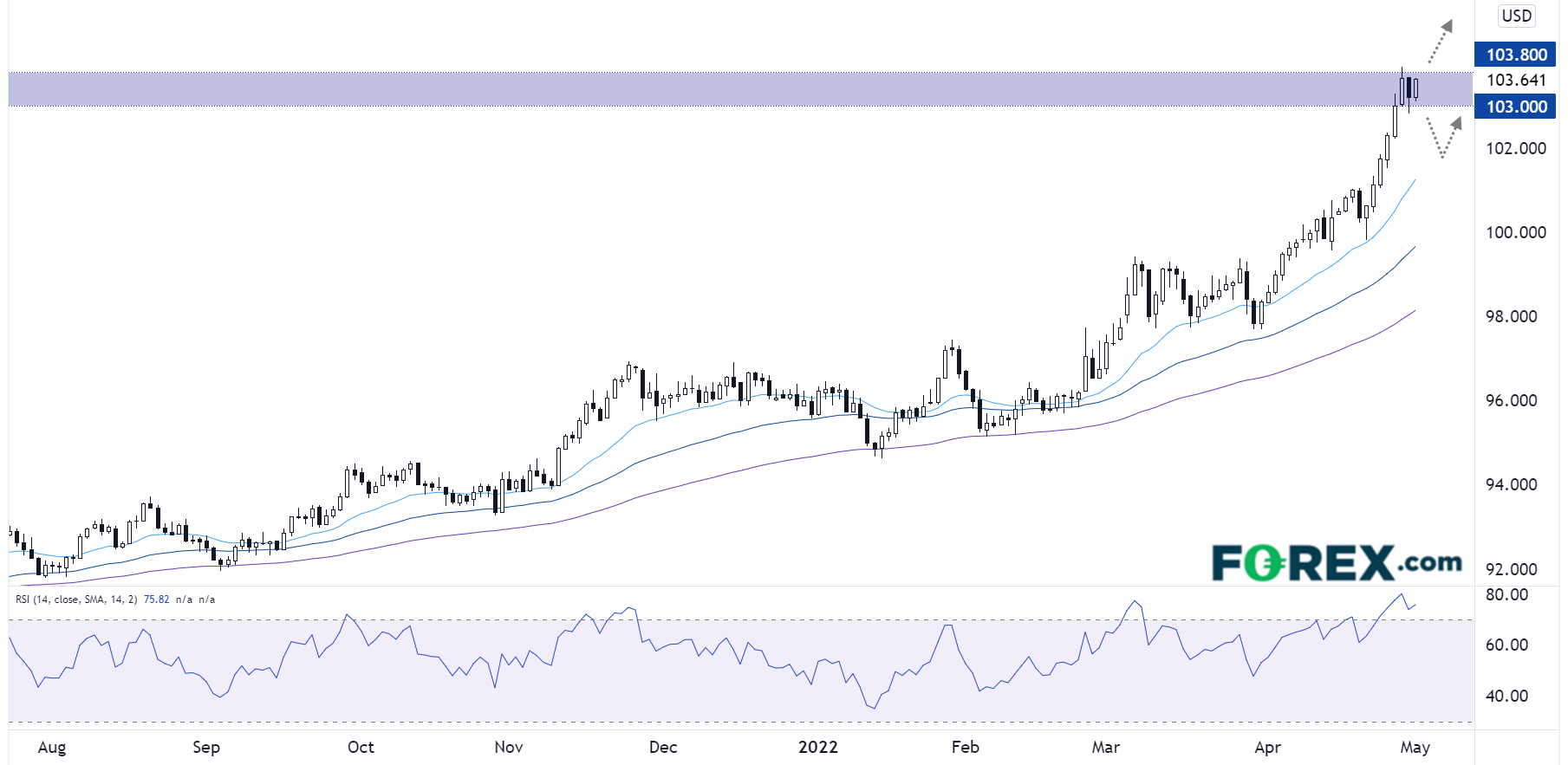 接下来看美元指数日图。这个全球储备货币正在测试近20年高点所在的103.00-103.80阻力带。14天RSI指标显示价格明显超买,如果美联储的立场不如部分分析师预期得强硬,短线有可能回撤。但多头可能选择在下探100.00-101.00区间时逢低买入,如果(或在美联储会议刺激下或在本月晚些时候)站上103.80,则有望打开上涨空间,夏末或持续上攻105.00甚至更高的水平。