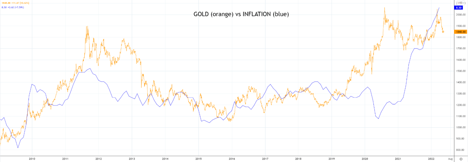 黄金被视为防止法币贬值、对冲通胀的工具。如下图所示,黄金直到最近才和黄金同步反弹。